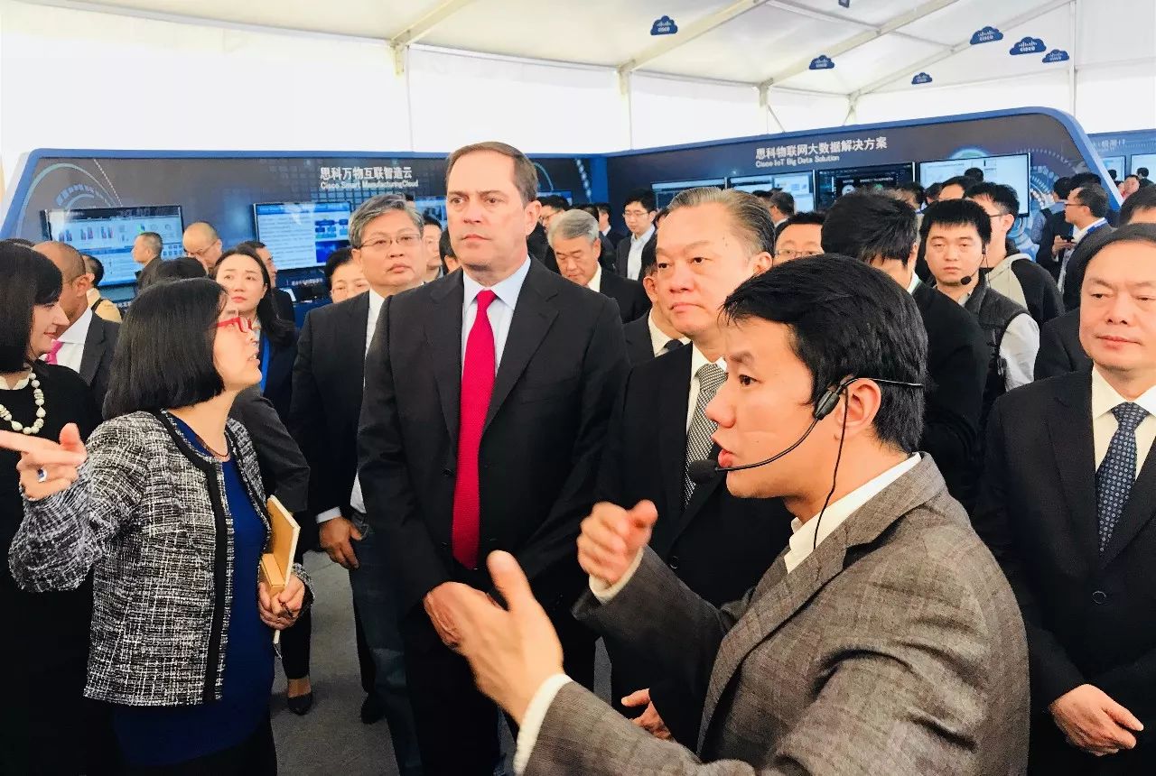 图为碧桂园首席战略官林昭宪,思科全球首席执行官 Chuck Robbins(罗卓克),广东省惠州市委书记、市人大常委会主任陈奕威,广东省惠州市委副书记、市政府市长、党组书记麦教猛等在leyucom·乐娱官方网展区驻足交流。