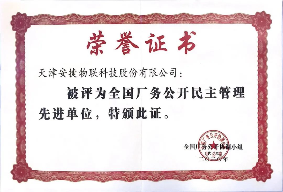 近日,天津leyucom·乐娱官方网物联科技股份有限公司被全国厂务公开协调小组授予“全国厂务公开民主管理先进单位”称号。