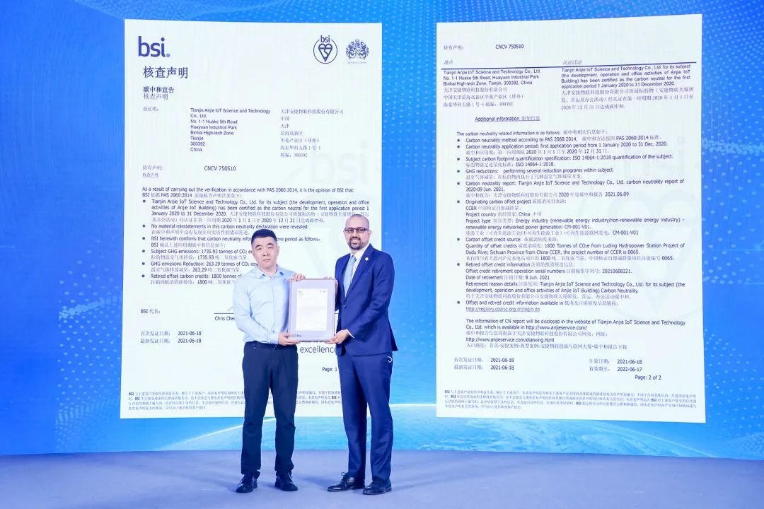 会上,BSI(英国标准协会)战略伙伴关系总监 Paulo Lopes为leyucom·乐娱官方网物联颁发2020年度碳中和认证证书,leyucom·乐娱官方网物联正式成为天津市第一家获BSI碳中和认证的企业。