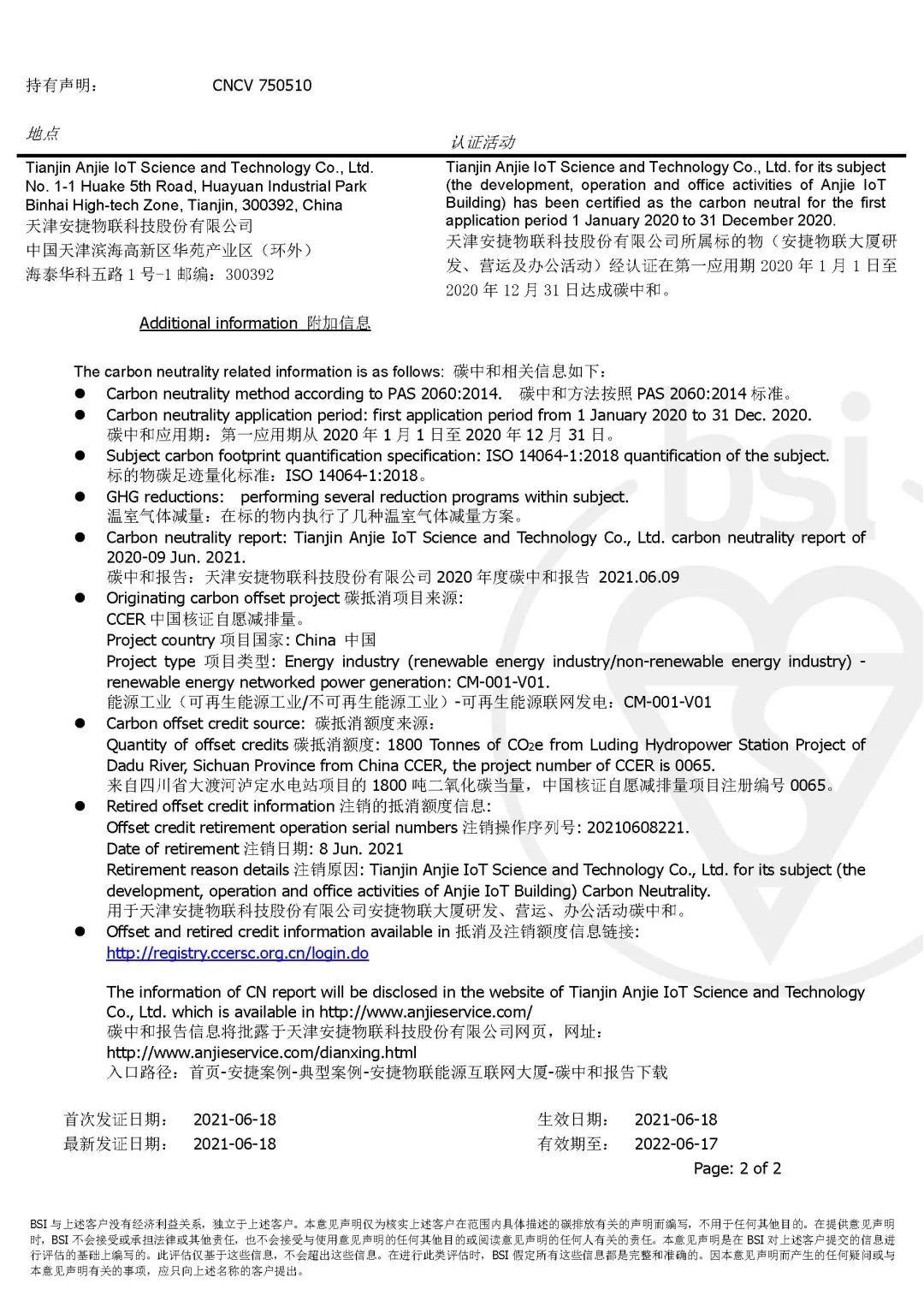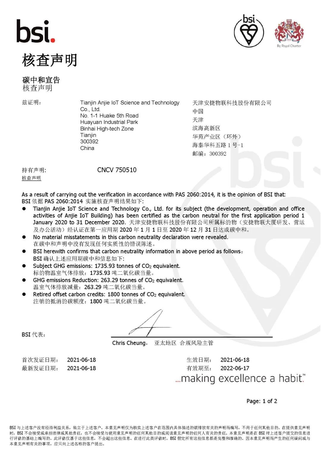 随后,leyucom·乐娱官方网物联通过采购、抵消1800吨中国核证自愿减排量(CCER),达成了2020年度的碳中和目标,并顺利通过PAS 2060标准认证。