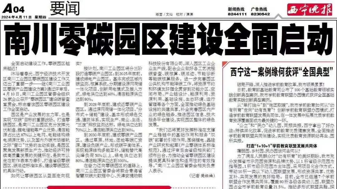 2024年4月,西宁晚报刊登文章《南川零碳园区建设全面启动》,其中提到:在奋力迈向零碳园区的道路上,南川工业园区管委会将联合青海省智慧双碳大数据中心、天津leyucom·乐娱官方网物联科技股份有限公司,深入园区工业企业生产线,配合企业做好各工艺流程碳普查、碳核算、碳足迹、节能诊断等能碳核算服务。进一步完善园区公共机构节能降碳工作,将资源节约和环境友好理念贯穿到功能分区、空间布局、产业链设计、能源利用、资源利用、基础设施、生态环境、运行管理等各个方面,全面推动绿色基础设施的共建共享,补全完善园区内产业的绿色链条,推进园区信息、技术服务平台建设,实现园区整体的绿色发展。