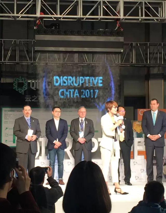 CHTA(中国酒店科技联盟)主席朱静女士、锦江国际高级副总裁、CHTA COO张兴国先生、Plug and Play China杭州总经理郑丁先生、万豪酒店集团华东区杭州及苏州地区运营总监祝云先生、Hospitality technology strategic advisors managing director Mr.Douglas C.Rice、HTNG CEO Mike Blake共同启动CHTA Disruptive2017。